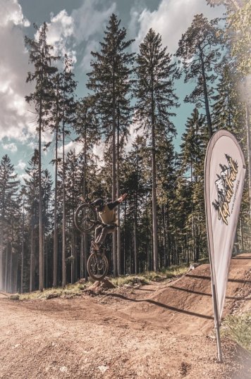 Večerní dešť nám zkazil trošku náladu, věříme však, že neděle bude v topu jako sobota, traily máme nalítané a snad zbyde čas na nějaký shred. Na rozehřátí dáme klasicky Selský trail, letíme dole kopcom jak šalení říkal jeden z Poláku. Traily sou v podstatě suche a dešť v noci jim jenom prospěl. Při dalších jízdách kombinujeme začátky Lesním, či Selským trailem a pří křížení pokračujeme černým Mamutím. Podél trailu jsou rozmístěné krásné vlajky TopOnTrail, nejen že dělají reklamu, ale plní účel, jde na nich vidět jestli fouká, nebo ne. Dnes bohužel fouká, ježdění si zkazit nenecháme, chvilkama na otevřených místech čekáme, v lese to člověk neřeší a jede. I když chvílema fučí, užíváme si co to jde. Ke konci ježdění dáváme menší sešn na poslední sekci Mamutího trailu, skoky tu jsou fakt libové. Padají nějaké tríčky, nějaký ten flip a jeden nešťastný pulflip. Peťa je celý, dneska to balíme a fičíme domu.